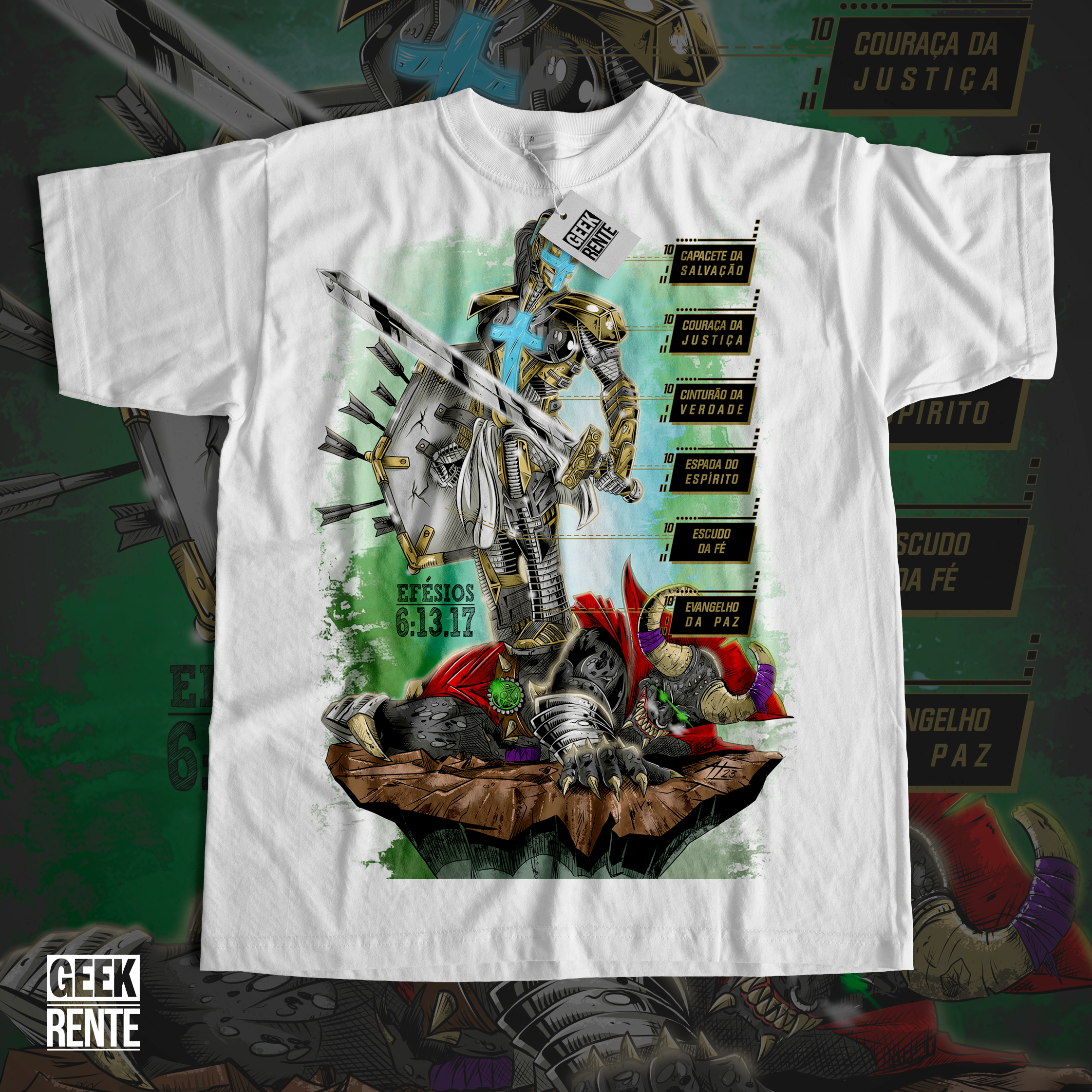 Estampa criada com o tema do versículo de (Efésios 6:13-17) Por isso, vistam toda a armadura de Deus, para que possam resistir no dia mau e permanecer inabaláveis, depois de terem feito tudo. Assim, mantenham-se firmes, cingindo-se com o cinto da verdade, vestindo a couraça da justiça